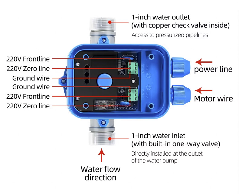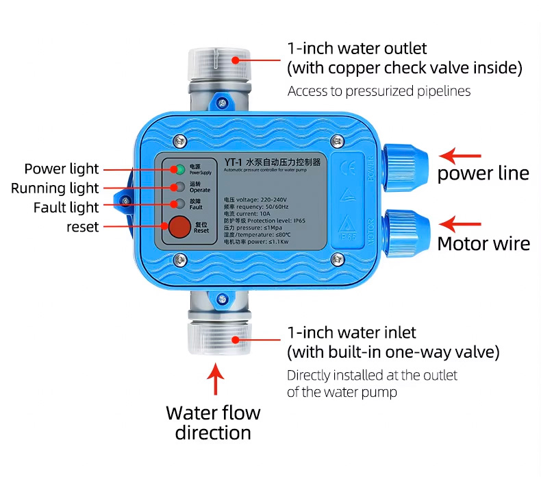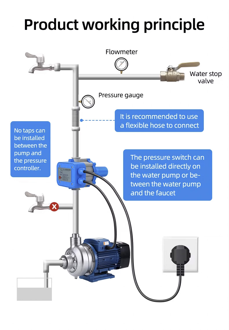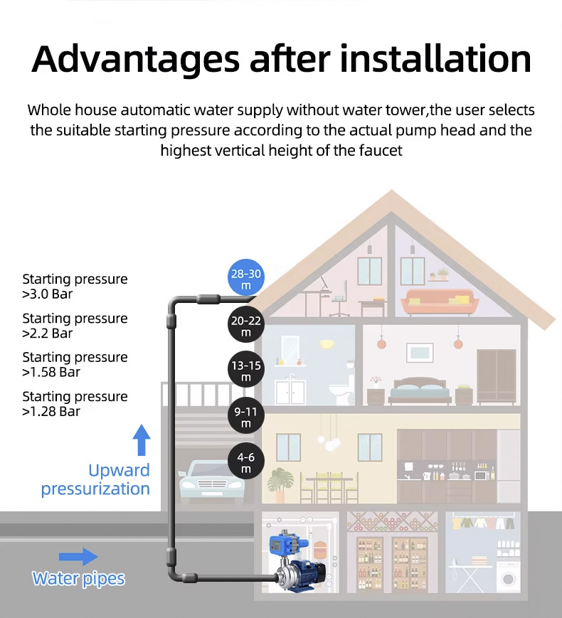 Автоматичен контролер на помпата Електронният контролер на налягането на водната помпа може да замени сложните инсталации на автоматичната водна помпа. Той има характеристиките на стабилна производителност, ниска поддръжка и дълъг живот.