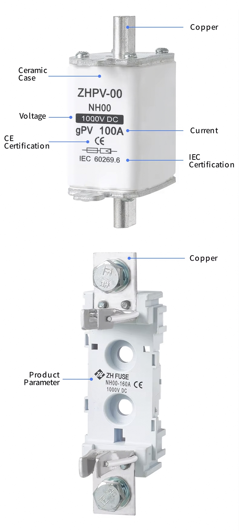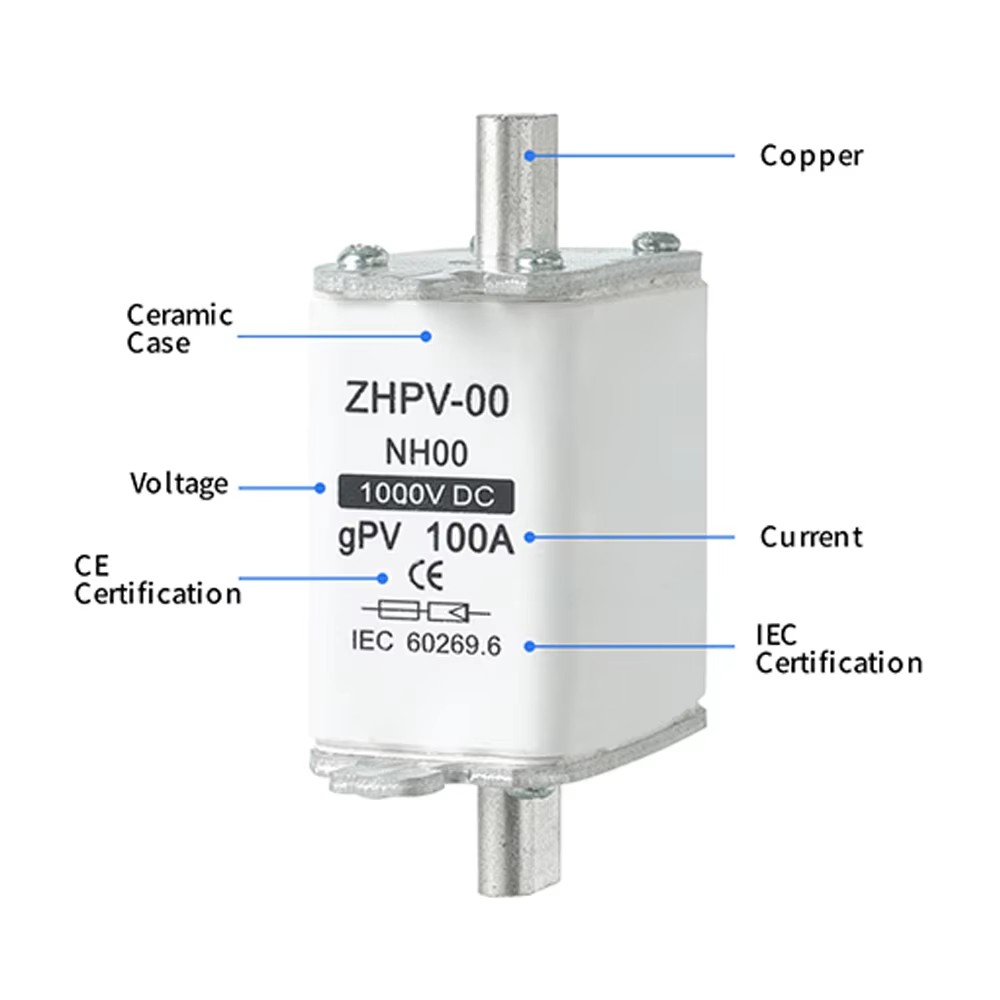 NH00 Фотоволтаична система DC 1000V 32~100A Предпазител Висококачествените материали са избрани, за да осигурят стабилни и надеждни характеристики на предпазителя, бърза скорост на реакция и висока безопасност. Компактен на външен вид, лесен за инсталиране, широко използван в различни системи като фотоволтаични комбинирани кутии, инвертори и разпределителни шкафове за постоянен ток. Фотоволтаичната система NH00 DC 1000V 32~100A Fuse Link е преминала множество международни сертификати и отговаря на стандартите на IEC, което я прави идеален избор за осигуряване на безопасна работа на системи за електроцентрали.