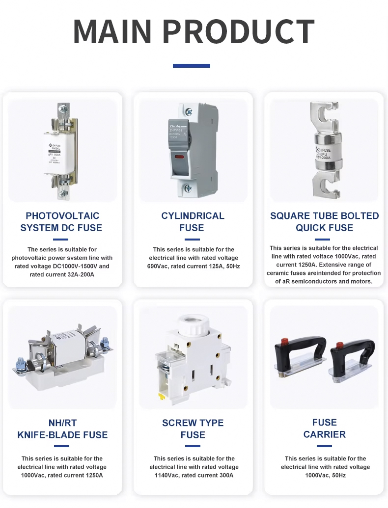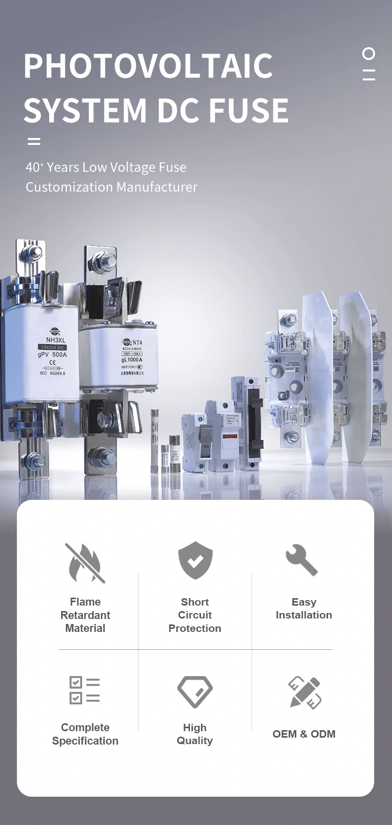 Фотоволтаичната система NH00 DC 1000V 32~100A предпазител е подходяща за защита от свръхток във фотоволтаични DC системи. Този продукт поддържа максимално напрежение от 1000V DC и диапазон на тока от 32~100A. Той е проектиран специално за слънчеви електроцентрали и системи за съхранение на енергия и може ефективно да предотврати повреда на оборудването, причинена от претоварване или късо съединение.