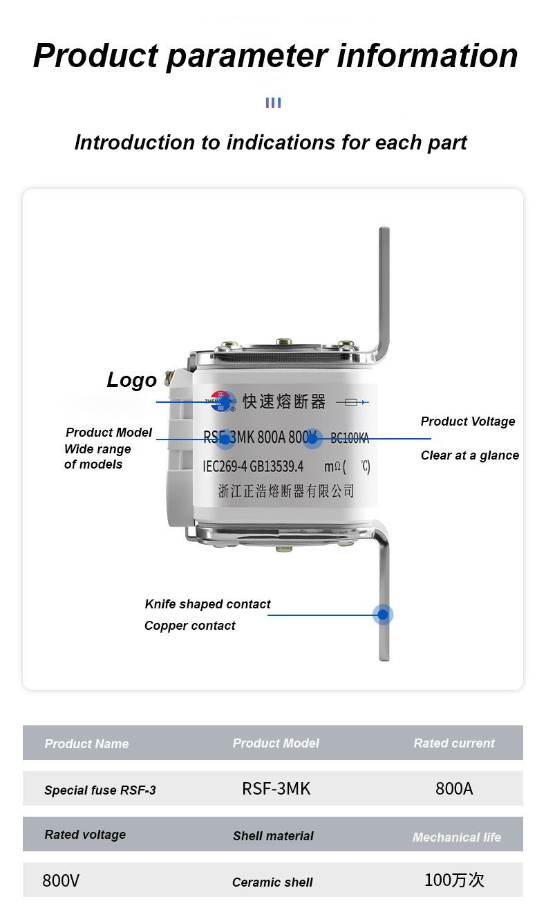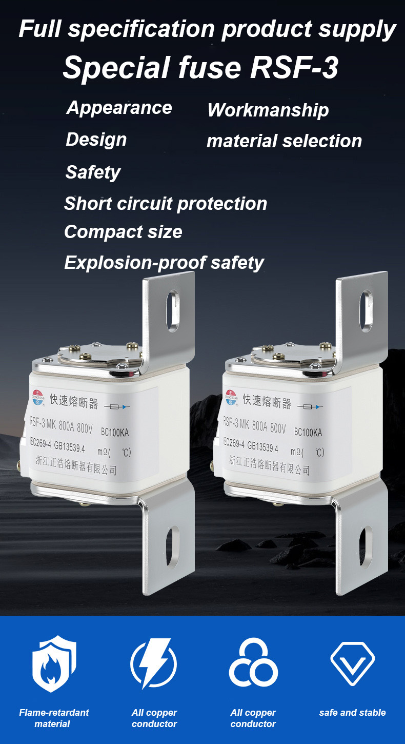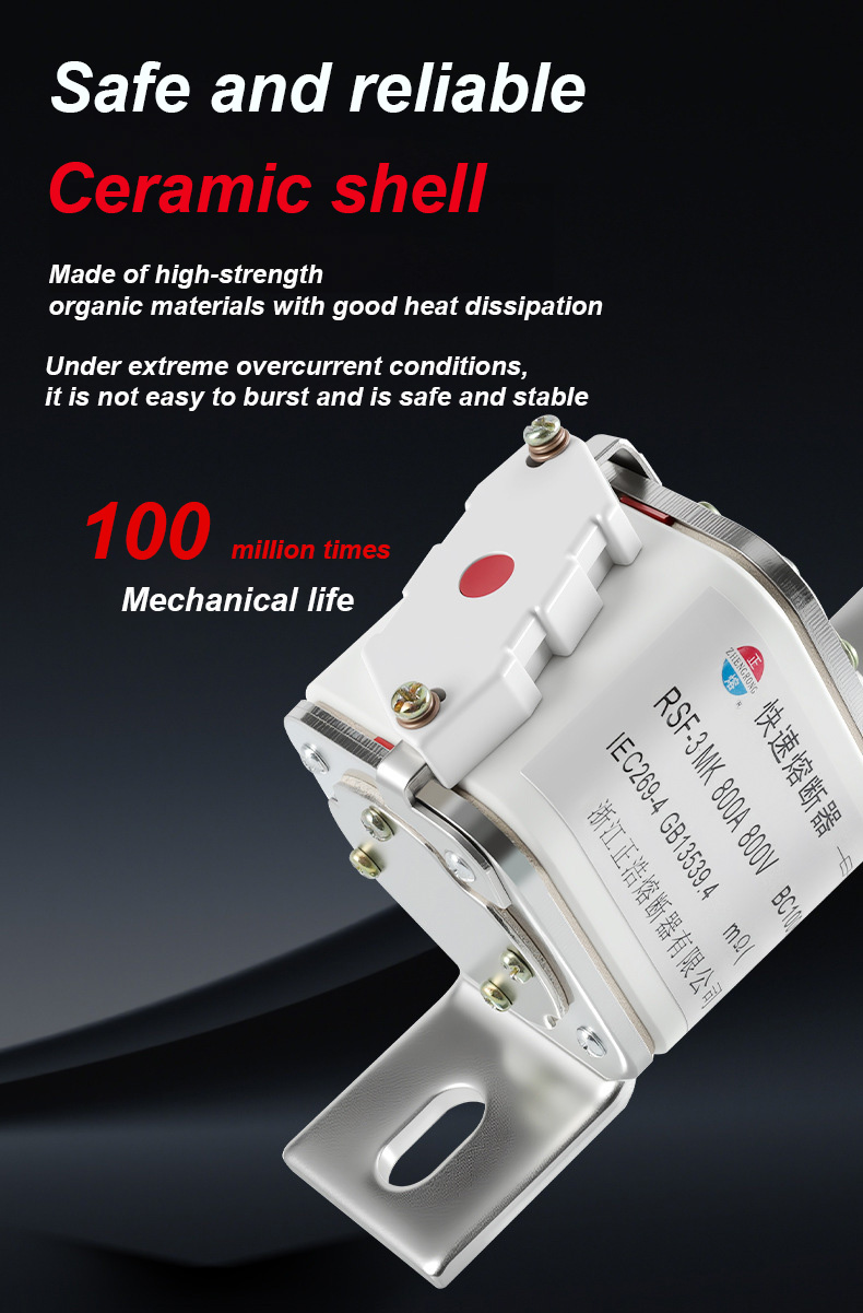 има номинално напрежение 500V и номинален ток 315A, което може ефективно да осигури електрическа безопасност, да предотврати претоварване и късо съединение. Предпазителите RSF-3MK 800V-800A BC100KA