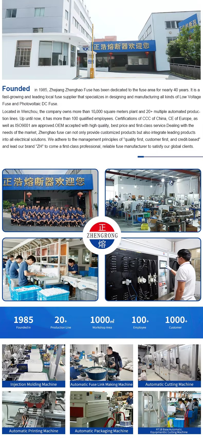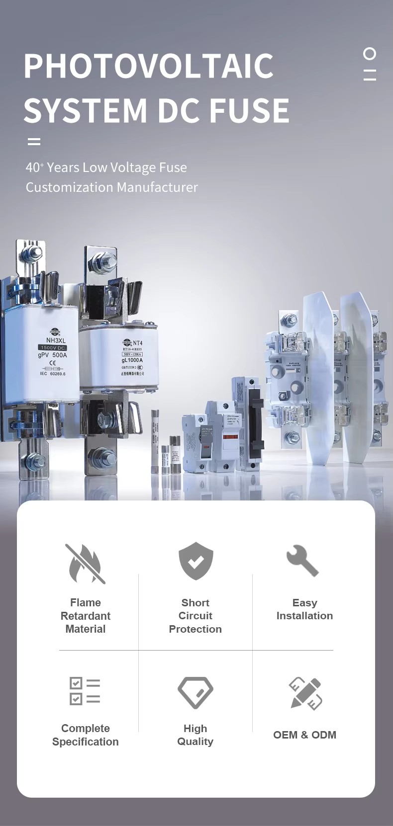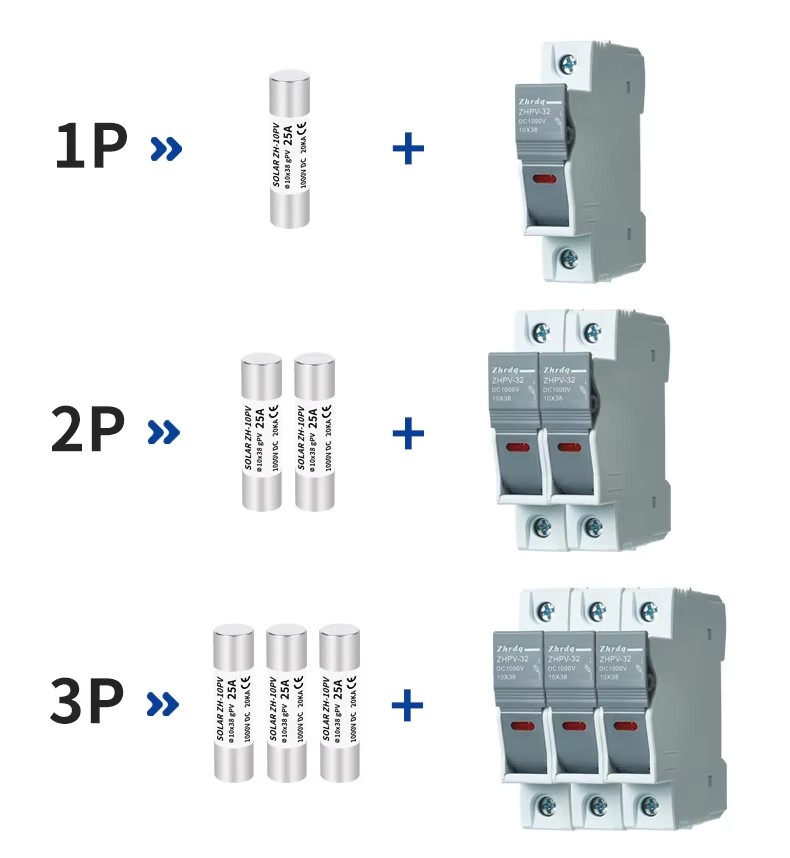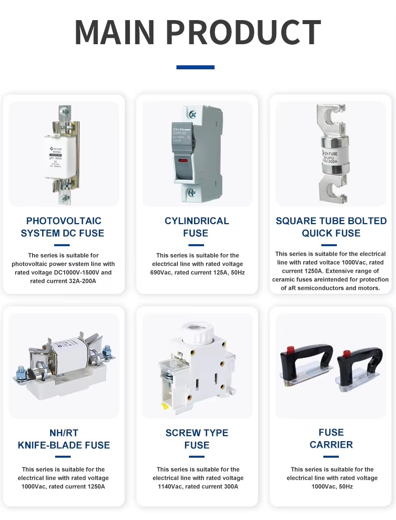 Структурните характеристики на ZHPV-125 1000V DC основата на предпазител и предпазителните връзки 22 × 58 мм цилиндрично керамично предпазител във фотоволтаичната система са както следва. Тази серия от предпазители се състои от връзка с предпазител и държач за предпазител. Променливото тяло с предпазител на напречното сечение, изработена от чист меден лист (или медна тел, сребърна тел, сребърен лист), е запечатано в тръба за предпазител, изработена от керамична или епоксидна стъклена тръба, пълна с химически обработен кварцов кварцов пясък като дъгова потушаваща среда. Двете страни на ядрото на предпазителя са надеждно свързани към крайната плоча чрез заваряване на точките, образувайки цилиндрична структура с форма на капачка. Основата на предпазителя на ZHPV-125 1000V е изработена от смола или пластмасова обвивка, притисната с токов удар, включително елемент на предпазител, който е свързан чрез нитове като опора за компонента на тялото на предпазителя на размера. Тази поредица от предпазители има предимствата на малък обем, лесна инсталация, безопасна употреба и красив външен вид.